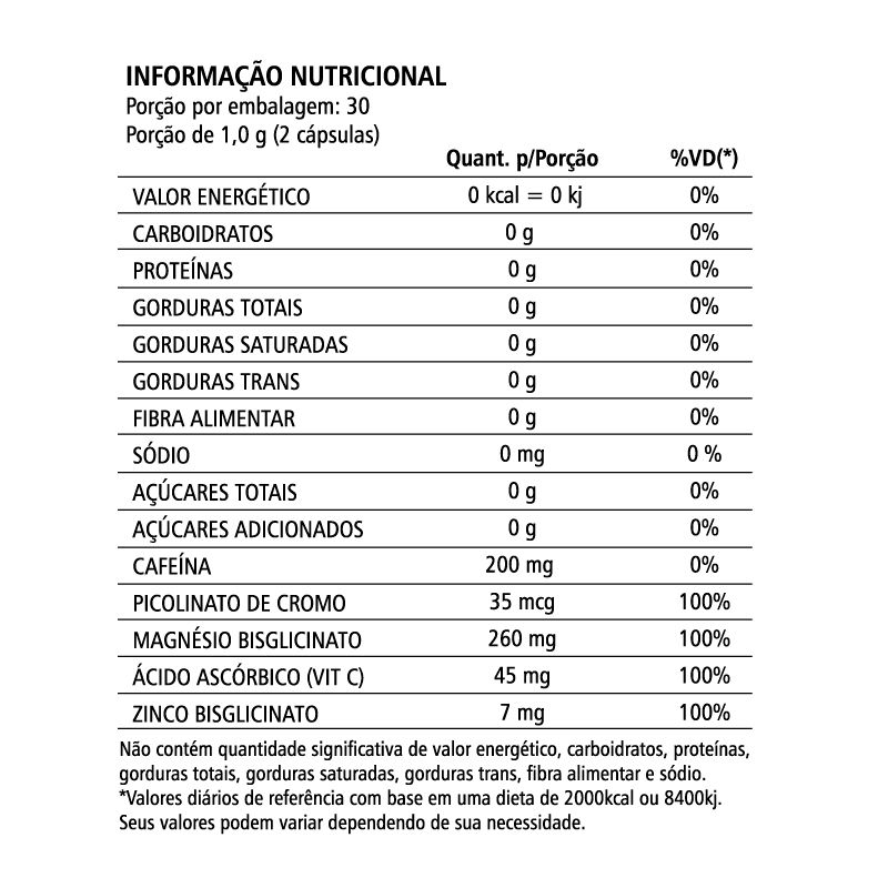 Composição: Café Verde, Picolinato de Cromo, Bisglicinato de Magnésio, Ácido Ascórbico e Bisglicinato de Zinco; Excipientes: Estearato de Magnésio; Antiumectante: Silicato de Magnésio e Dióxido de Silício;
