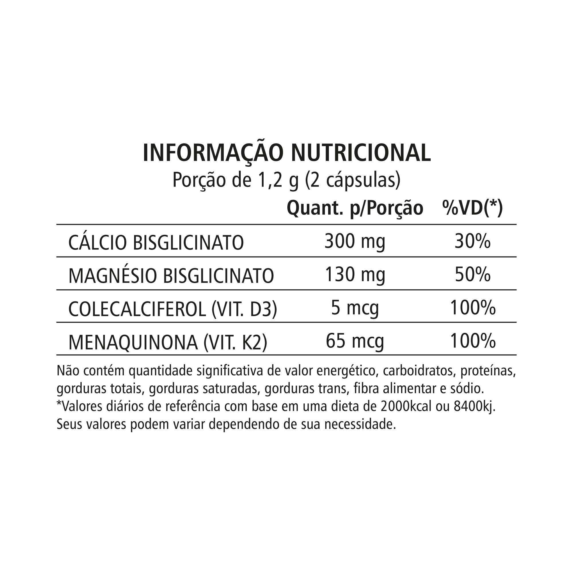 Composição: Cálcio, Magnésio Bisglicinato, Vitamina D3, Vitamina K2;