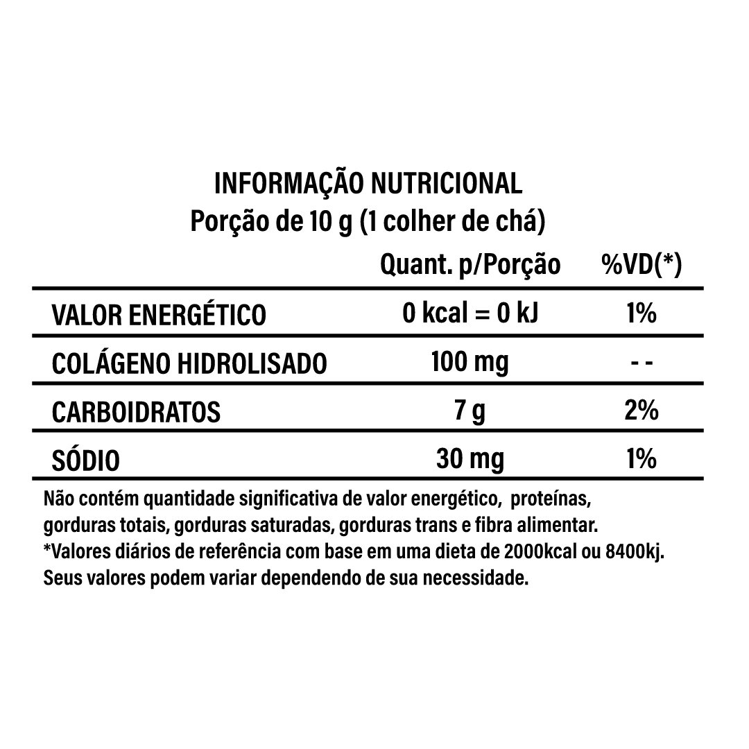 Composição: Folhas de chá verde em pó, colágeno hidrolisado, Maltodextrina, gengibre em pó, acidulante ácido cítrico, aroma idêntico ao natural de limão e mel; Antiumectante: dióxido de silício e edulcorante Sucralose;
