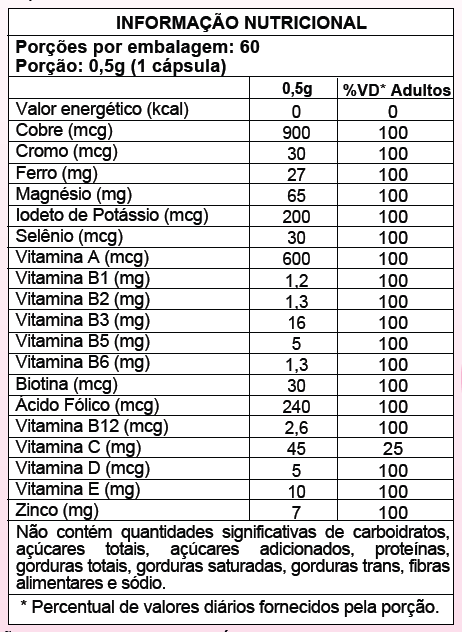 Composição: Cobre, Cromo, Ferro, Magnésio, Iodeto De Potássio, Selênio, Retinol, Tiamina, Riboflavina, Niacina, Ácido Pantotênico, Piridoxina, Biotina, Ácido Fólico, Cianocobalamina, Ácido Ascórbico, Colecalciferol, Tocoferol, Zinco;