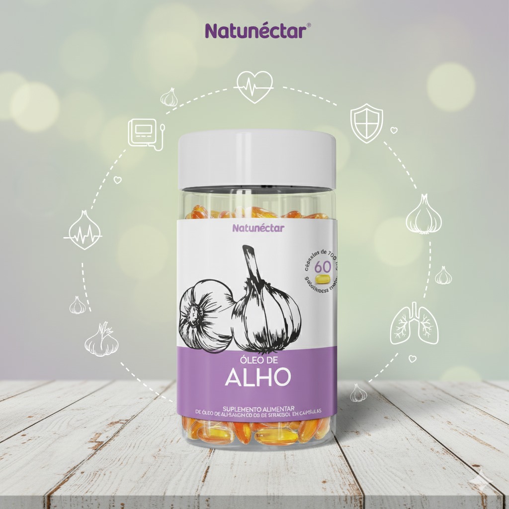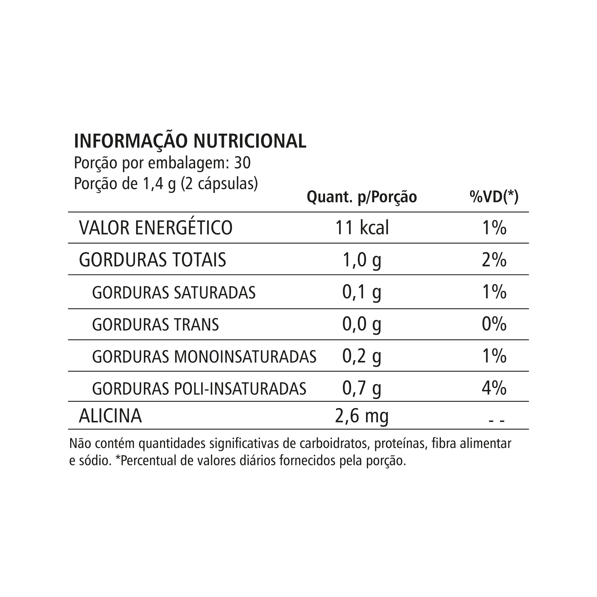 Composição: Óleo de Alho, Óleo de Soja; Cápsula: Água purificada, Gelificante gelatina INS 428, Umectante Glicerol INS 422;