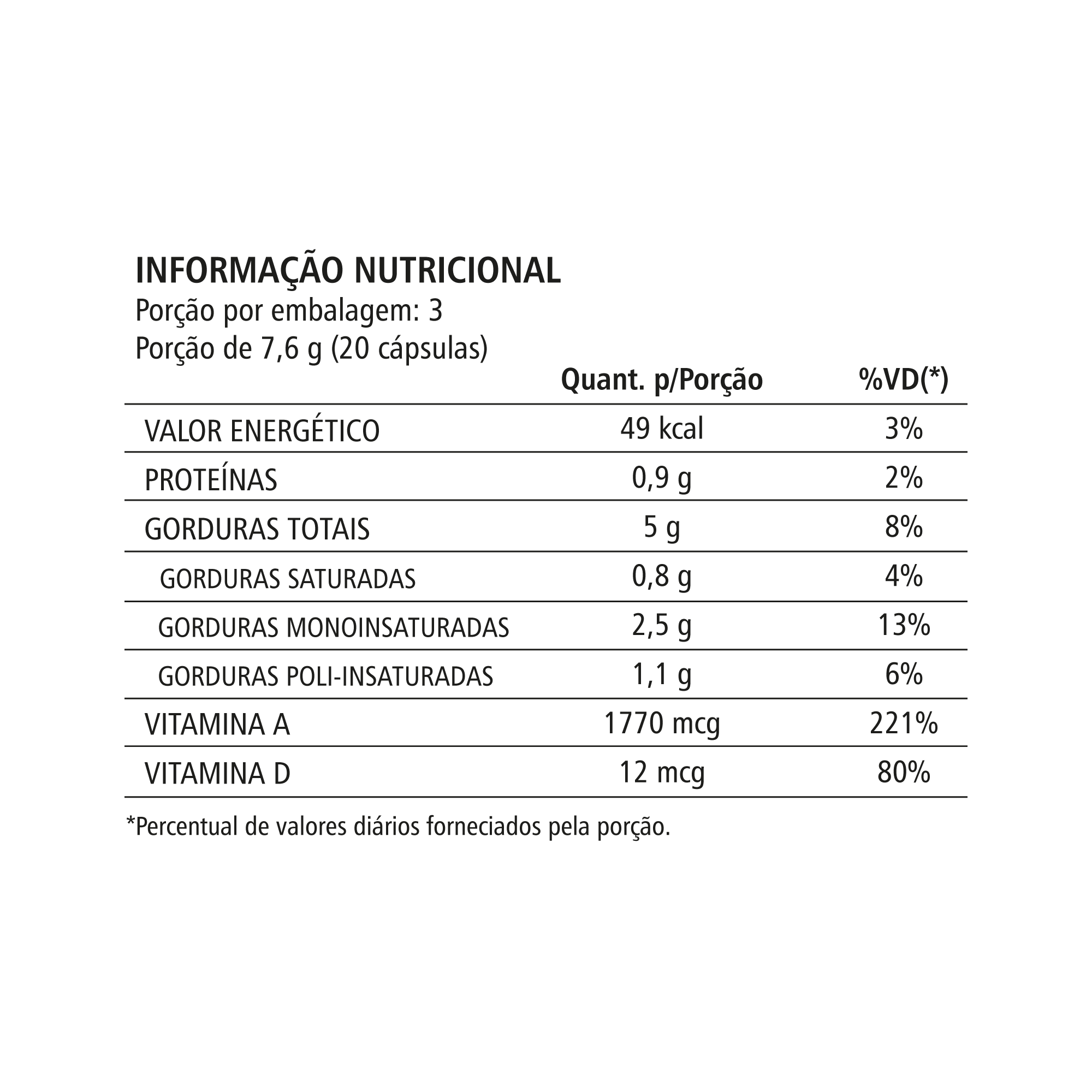 Composição: Óleo de Fígado de Bacalhau; Cápsula: Água purificada, Gelificante gelatina INS 428, Umectante glicerol INS 422;