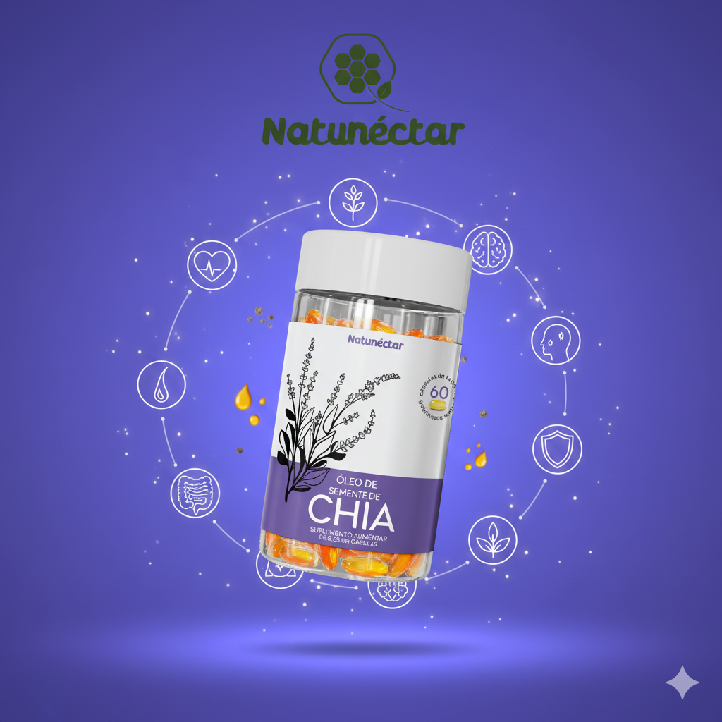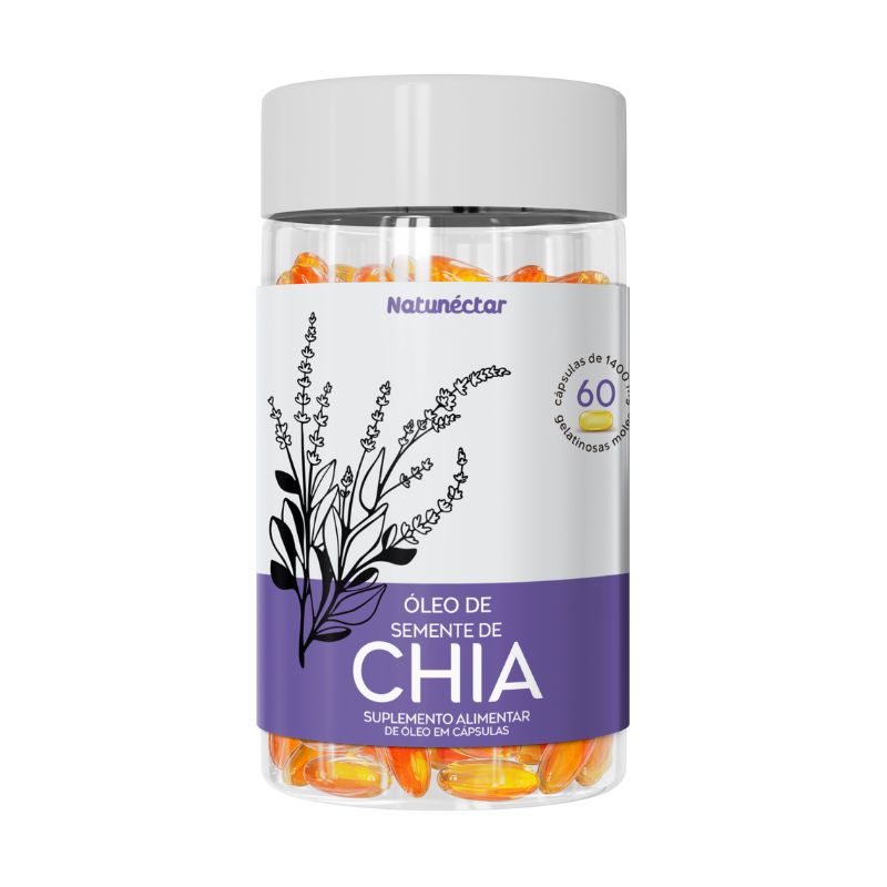 Composição: Óleo de Semente de Chia (Salvia hispânical.); Cápsula: Gelatina, água purificada, Glicerina e agente de massa sorbitol;