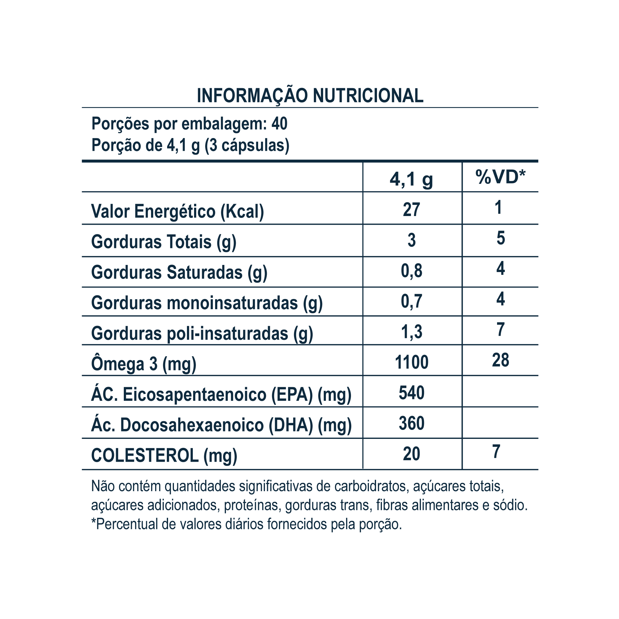 Composição: Óleo de peixe, Antioxidante D-Alfa-Tocoferol INS 307a; Cápsula: Água purificada, Gelificante gelatina, Umectante Glicerol;