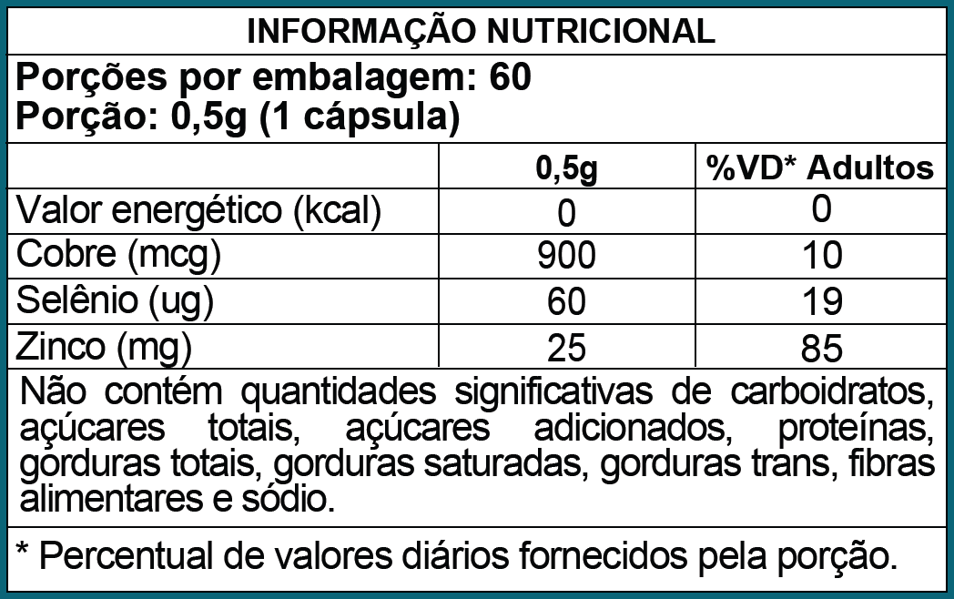 Selênio+Cobre+Zinco – 60 Cápsulas