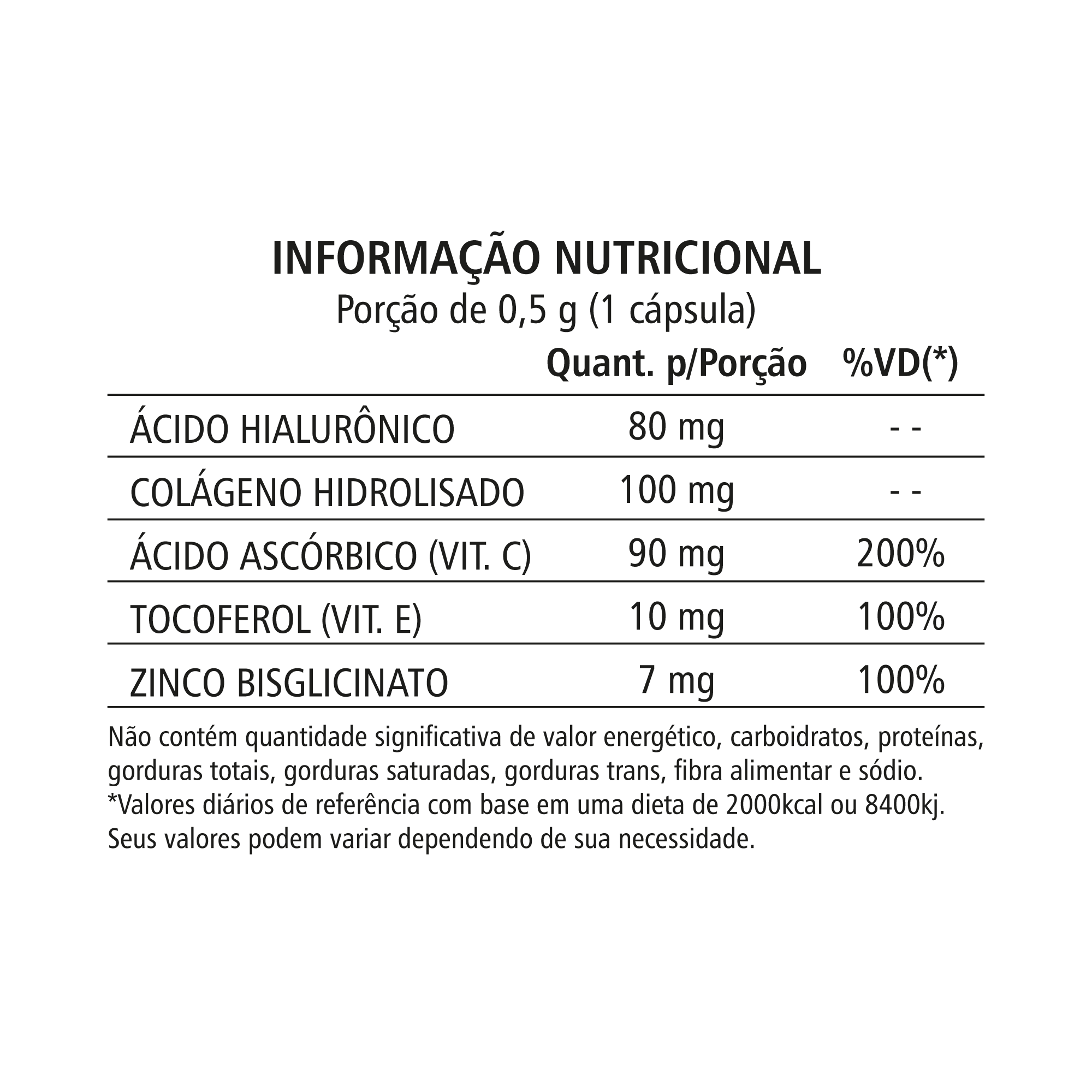 Composição: Ácido Hialurônico, Colágeno Hidrolisado, Ácido Ascórbico (Vit. C), Tocoferol (Vit. E), Zinco;