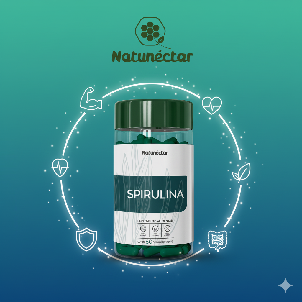Composição: Spirulina em pó; Excipientes: Estearato de Magnésio; Antiumectante: Silicato de Magnésio e Dióxido de Silício;