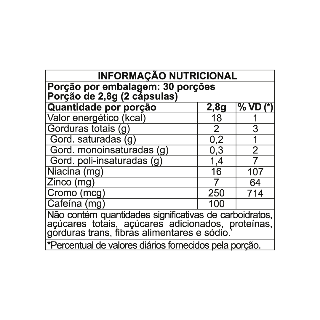 Composição: ÓLEO DE CÁRTAMO (CARTHAMUS TINCTORIOUSL.), ÓLEO DE SEMENTE DE UVA (VITIS VINIFERAL.), CAFEÍNA/1,3,7-TRIMETHYLXANTHINE, NICOTINAMIDA (NIACINA), BISGLICINATO DE ZINCO, E PICOLINATO DE CROMO. COMPOSIÇÃO DA CÁPSULA: GELATINA, ÁGUA PURIFICADA, GLICERINA, ÓLEO DE GIRASSOL (HELIANTHUS ANNUUS L.) E AGENTE