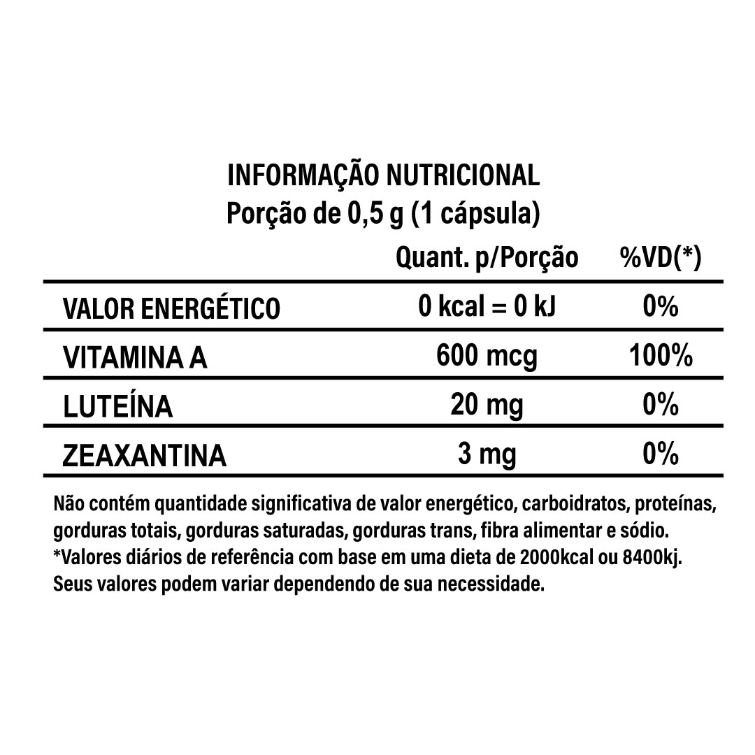 INGREDIENTES: VITAMINA A, LUTEÍNA, ZEAXANTINA. EXCIPIENTES: ESTEARATO DE MAGNÉSIO (LUBRIFICANTE). ANTIUMECTANTE: SILICATO DE MAGNÉSIODIÓXIDO DE SILÍCIO.